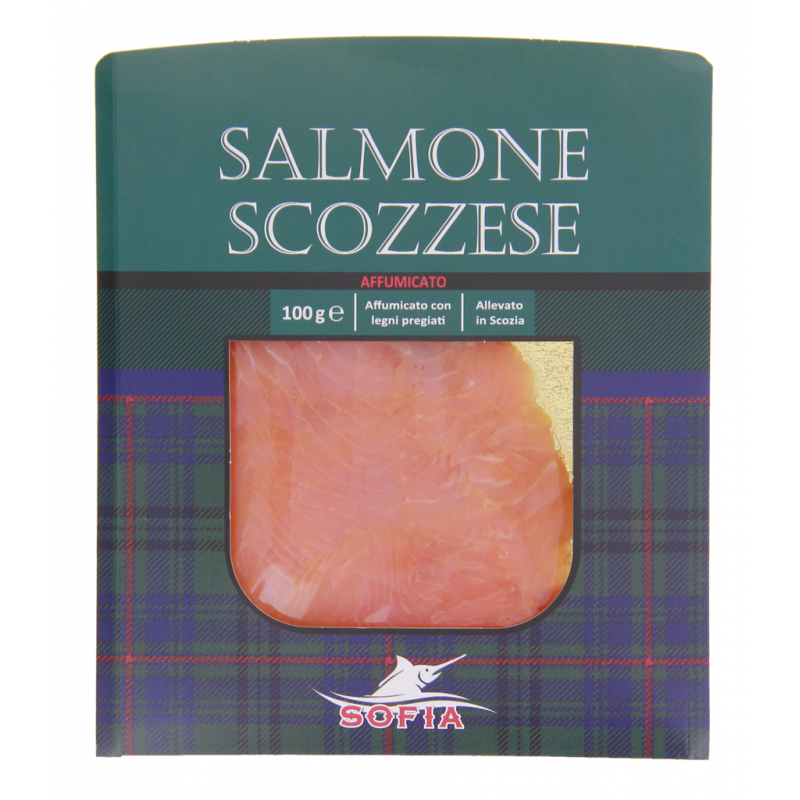 Filetto di salmone scozzese senza pelle (Salmo salar), sale, fumo naturale. Allevato in Scozia. Pescato con draga. Può contenere eccezionalmente lische.