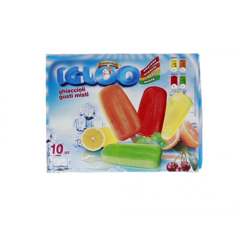 GHIACCIOLO AL GUSTO Dl LIMONE (COLORE BIANCO) acqua, zucchero, sciroppo di glucosio - fruttosio, succo di limone 6%, acidificante: acido citrico, aromi naturali. GHIACCIOLO AL GUSTO Dl ARANCIA: acqua, zucchero, sciroppo di glucosio - fruttosio, succo di arancia 11%, acidificante: acido citrico, aromi, aromi naturali. GHIACCIOLO AL GUSTO Dl AMARENA: acqua, zucchero, sciroppo di glucosio - fruttosio, succo di amarena 8%, acidificante: acido citrico, aromi, aromi naturali. GHIACCIOLO AL GUSTO Dl MENTA: acqua, zucchero, sciroppo di glucosio - fruttosio, aromi, coloranti: complessi delle clorofilline con il rame e curcumina, acidificante: acido citrico.