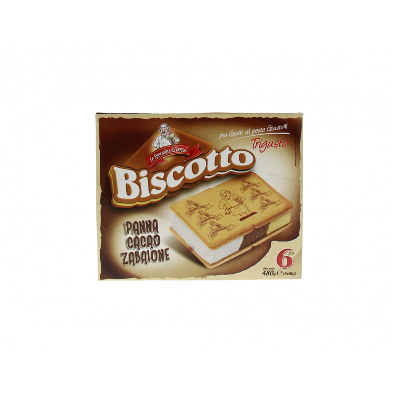 Gelato (55%) (acqua, zucchero latte magro in polvere, olio di cocco, sciroppo di glucosio-fruttosio, cacao in polvere (1.7%), destrosio, emulsionanti: mono e digliceridi degli acidi grassi; stabilizzanti: alginato di sodio, aroma panna; aroma zabaione (cotiene uova), coloranti: caroteni e curcumina; biscotti (45%) (farina di frumento, zucchero, oli vegetali (cocco, girasole), sciroppo di glucosio-fruttosio, coloranti: caramello; cacao magro in polvere, estratto di malto da orzo, latte scremato in polvere, emulsionanti: lecitina di girasole agenti lievitanti: bicarbonato di sodio, bicarbonato di ammonio; sale, aromi).
