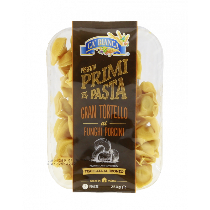 Pasta (60%): Semola di grano duro, farina di grano tenero tipo "00", uova (18%), acqua. Ripieno (40%): ricotta (siero di latte, crema di latte, sale), siero di latte in polvere, olio di semi di girasole, patate disidratate, acqua, funghi Porcini 6% (Boletus edulis e relativo gruppo), farina di grano tenero, sale, formaggio grattugiato (latte, sale, caglio), fibra vegetale (bambù, psyllium), aroma. Può contenere: pesce, molluschi, crostacei, senape, soia e frutta a guscio.
