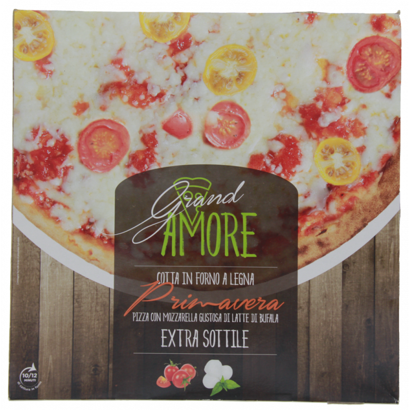 Farina di frumento, polpa di pomodoro 19.7%, acqua, mozzarella 11,4%,(latte pastorizzato, sale, caglio microbico: fermenti lattici), mozzarella gustosa di latte di bufala 6,5% (latte di bufala pastorizzato, siero innesto, sale, caglio animale), pomodori rossi 4,9%, pomodori gialli 4.9%, semiconcentrato di pomodoro 43%, sale, olio di oliva, destrosio, farina di frumento maltato, origano essiccato, lievito.