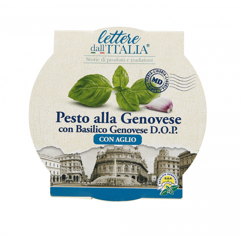 Olio dl semi di girasole, basilico genovese DOP 24%, latte intero in polvere reidratato, formaggi grattugiati (latte, sale, caglio) 10%, pecorino romano DOP (latte di pecora, sale, caglio) 3.5%, anacardi, burro (latte), sale, pinoli 1%, fibra vegetale, aglio (solfiti) 0,1%, antiossidante: E.300, correttore di acidità: E270. conservante: E200.