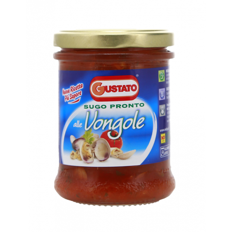 Polpa di pomodoro (45%). vongole (Venus gallina) (30%) brodo di vongole, pomodoro doppio concentrato, olio di semi di girasole, vino bianco (solfiti), amido modificato di mais, sale, prezzemolo , zucchero, aglio, cipolla, estratto di lievito, aroma rosmarino, pepe, peperoncino.