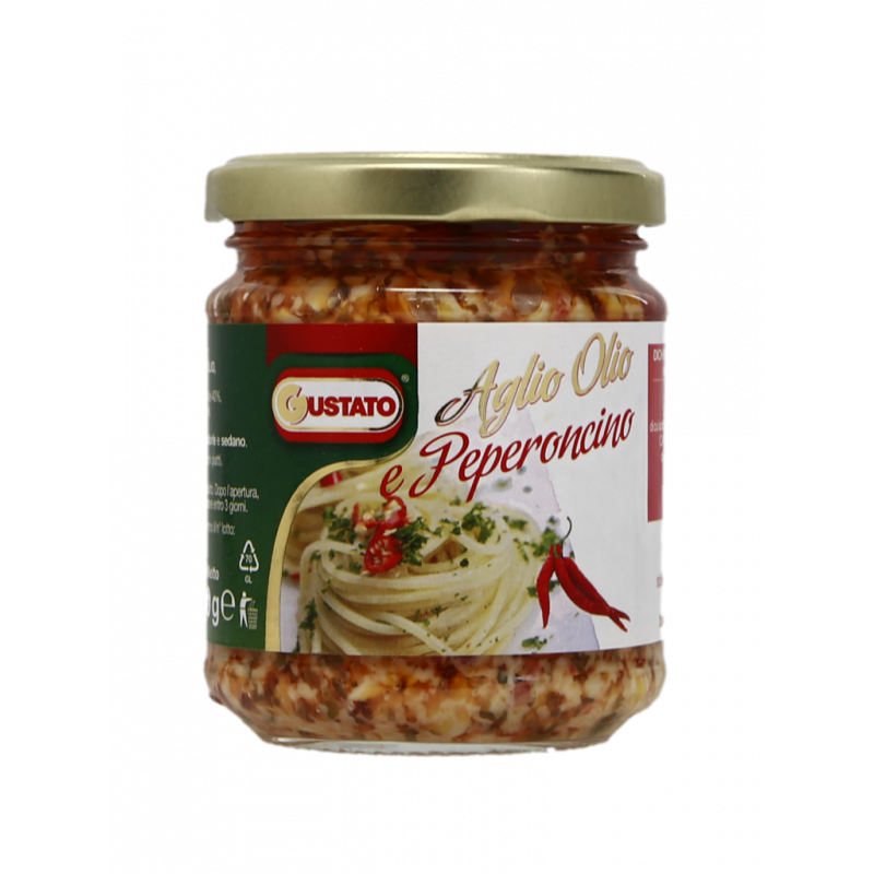 Olio di semi di girasole 40%, aglio 37%, peperoncino 20%, sale, prezzemolo 1%, aceto di vino. Può contenere tracce di mandorle e sedano.