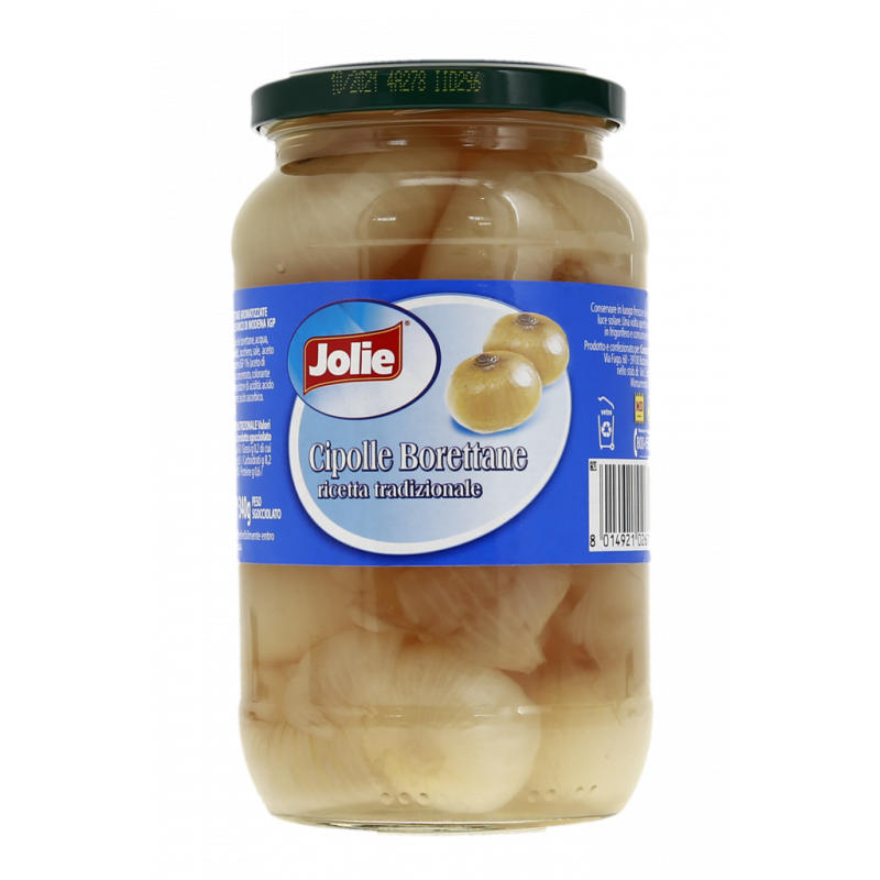 Cipolle borettane, acqua, aceto di vino (solfiti), zucchero, sale, aceto balsamico di Modena IGP 1% (aceto di vino, mosto d'uva concentrato, colorante E150d) (solfiti), regolatore di acidità: acido citrico, antiossidante: acido ascorbico. Senza glutine.
