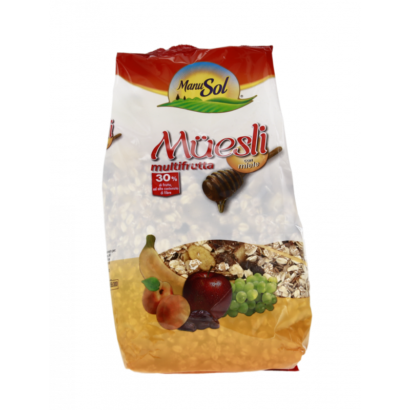 Fiocchi di frumento integrali (glutine), fiocchi d'avena (glutine), frutta in proporzione variabile 30% [uva sultanina, datteri, banane (banane, olio di cocco, zucchero), albicocche, mele], cornflakes (farina di mais, zucchero, estratto di malto d'orzo (glutine), sciroppo di glucosio, sale), miele 2%. Può contenere tracce di frutta a guscio.