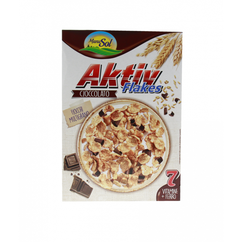 Riso (43%), riccioli di cioccolato fondente (180/0) (zucchero, pasta di cacao, burro di cacao, emulsionante: lecitina di soia, aroma naturale di vaniglia), frumento integrale zucche- ro, glutine di frumento, latte scremato in polvere, germe di frumento, amido di frumento, sale, estratto di malto d'orzo, agente lievitante: carbonato acido di sodio, emulsionante: mono- e digliceridi degli acidi grassi, vitamine (BI,B2, PP, B6, acido folico, BI 2, B5), ferro. Può contenere frutta a guscio e senape, Fiocchi di riso e frumento integrale e ricchi di di cioccolato fondente