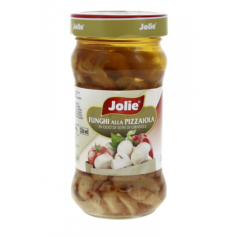 Funghi prataioli coltivati "psalliota bispora" 55,1%, olio di semi di girasole, passata di pomodoro 2%, peperoni, aceto di vino, zucchero, capperi, sale, aromi naturali, correttori di acidità: acido citrico e acido lattico, antiossidante: acido-ascorbico.