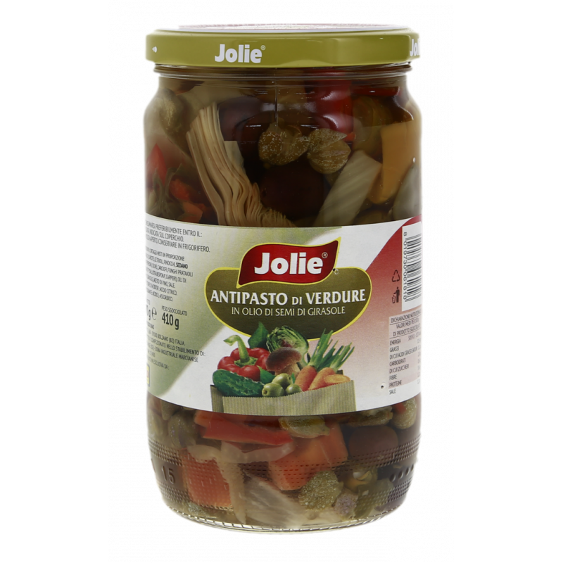 Ortaggi misti in proporzione variabile (carote, cetrioli, finocchi, sedano rapa, peperoni, olive, carciofi, funghi prataioli coltivati "psalliota bispora", capperi), oli di semi di girasole, aceto di vino, sale. Correttore di acidità: acido citrico. Antiossidante: acido l-ascorbico.
