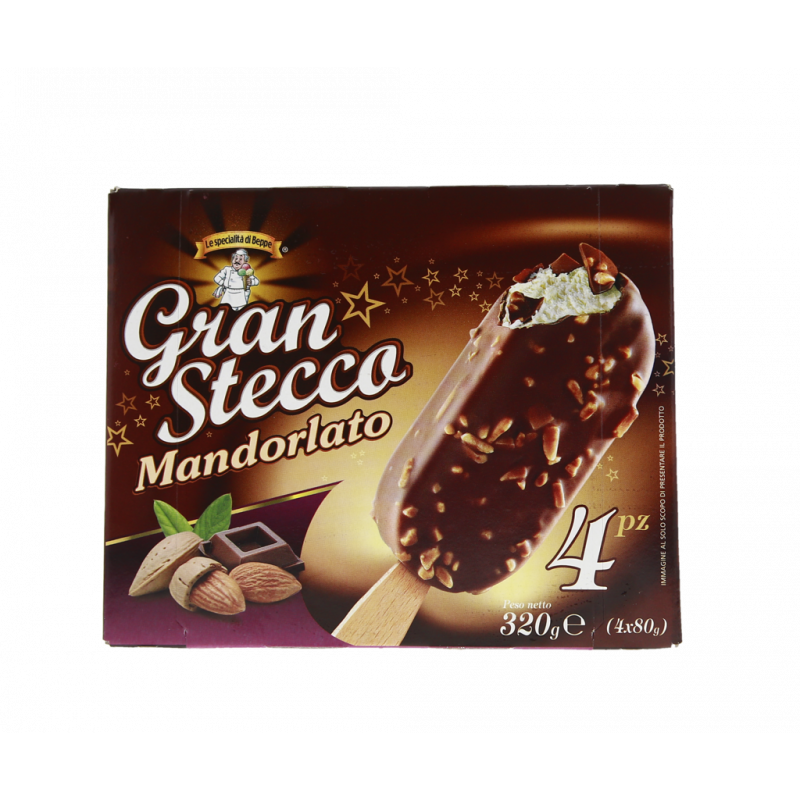 Latte scremato reidratato, copertura al cioccolato al latte 25% (cioccolato al latte 80% (zucchero, burro di cacao, latte in polvere, pasta di cacao, emulsionanti (lecitine),aroma naturale di vaniglia), olio di cocco), acqua, zucchero, olio di cocco, mandorle tostate in pezzi (5%), sciroppo di glucosio-fruttosio, lattosio e proteine del latte, emulsionanti (mono- e digliceridi degli acidi grassi), addensanti (farina di semi di carrube, gomma di guar), coloranti (caroteni), aroma naturale di vaniglia con altri aromi naturali (contiene latte) (0,04%), stabilizzanti (carragenina), aroma naturale di cartamo.