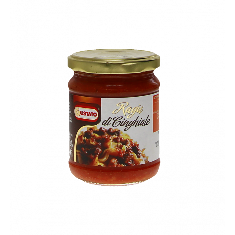 Pomodoro (68%), carne di cinghiale (15%), cipolla, pancetta din suino (carne di suino, sale, destrosio, zucchero, aromi, spezie), carote, olio di semi di girasole, vino rosso, sedano, burro, sale, zucchero, olio extra vergine di oliva, aglio, miscela di spezie, aromi, correttore di acidità: acido lattico. Può contenere tracce di pesce, molluschi, soia, uova e frutta a guscio.