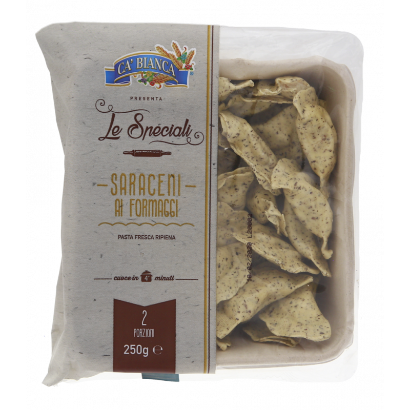 PASTA FRESCA CON GRANO SARACENO E RIPIENO AL FORMAGGIO. Ingredienti: Pasta fresca 50%: farina di grano tenero tipo "00, semola di grano duro, farina di grano saraceno 5% (3% sul totale), uova 18% (9 % sul totale), acqua, Ripieno 50%: ricotta 30, 7% (15,4% sul totale) (Siero di latte, latte, sale), formaggio pecorino 25% (12, 5% sul totale) (latte di pecora, caglio, sale), pangrattato (farina di grano tenero tipo "0, acqua, sale), formaggio 12% (6% sul totale) (latte, sale, caglio, fermenti lattici), riso, acqua, sale, pepe, noce moscata, conservante: acido sorbico, Può contenere tracce di: crostacei, pesce, sedano, molluschi, frutta a guscio.