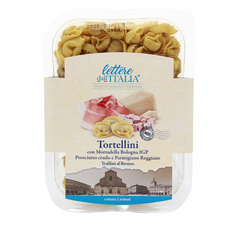 INGREDIENTI: Pasta (65%) semola di grano duro, farina di grano tenero tipo "00", uova di galline allevate a terra (18%), acqua, Ripieno (35%): Mortadella Bologna IGP 40% (carne di suino, sale, aromi naturali, antiossidante: ascorbato di sodio, conservante: nitrito di sodio, prosciutto crudo stagionato 33% (carne di suino, sale), formaggio "Parmigiano Reggiano DOP"18,4% (latte, sale, caglio), pangrattato (farina di grano tenero "tipo O", lievito, acqua, sale), sale, noce moscata, Può contenere pesce, molluschi, crostacei, senape, soia e frutta a guscio.