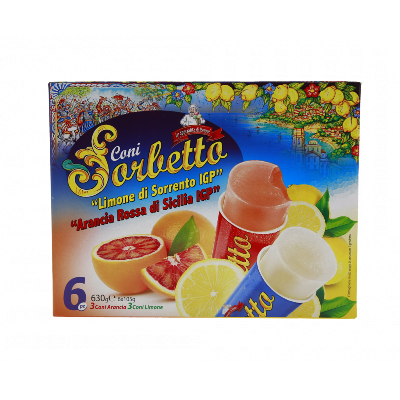 Gusto limone: acqua, succo di "Limone di Sorrento I.GP.' (15% che corrispondono a 0,5 kg di limoni di Sorrento I.G.P. per ogni kg di sorbetto al limone), zucchero, sciroppo di glucosio-fruttosio, addensanti (farina di semi di carrube, gomma di guar), acidificanti (acido citrico), "olio essenziale di Limone di Sorrento I.GP.'. Ingredienti gusto arancia: acqua, succo di "Arancia Rossa di Sicilia I.GP.' (15%), zucchero, sciroppo di glucosio-fruttosio, acidificanti (acido citrico), addensanti (farina di semi di carrube, gomma di guar); concentrato di barbabietola, olio essenziale di "Arancia Rossa di Sicilia I.G.P".