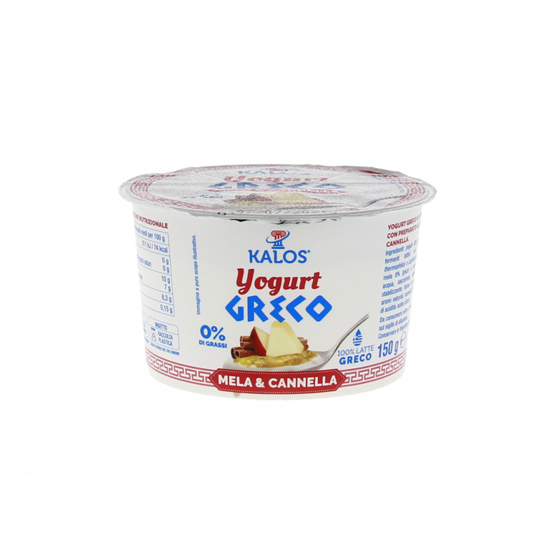 YOGURT GRECO 0% Dl GRASSI CON PREPARATO ALLA MELA E CANNELLA. Ingredienti: yogurt 80% [latte scremato, fermenti lattici vivi (Streptococcus thermophilus e Lactobacillus bulgaricus)l, mela 8% (pezzi e purea concentrata), acqua, saccarosio, amido di tapioca, stabilizzante: farina di semi di carrube; aromi naturali, cannella 0,02%, correttore di acidità: acido citrico.