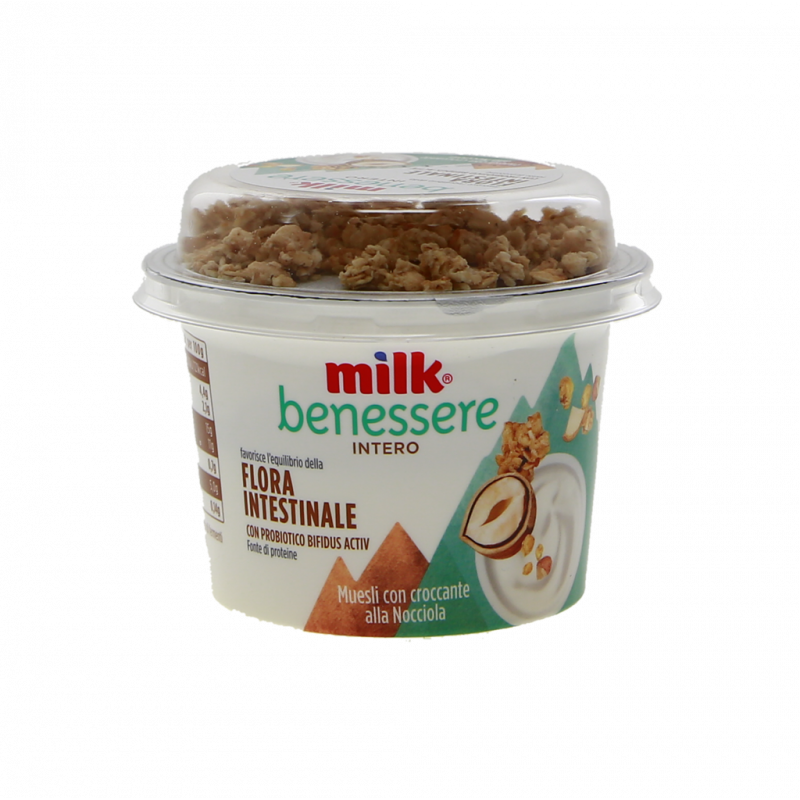 Latte fermentato con Streptococcus thermophilus, lactobacillus bulgariui , preparazione di cerali 10% muesli 95% fiocchi d'avena, zucchero, olio di semi di girasole, scaglie di cocco, sciroppo di glucosio, fruttosio, riso soffiato, farina di riso, zucchero, glutine di frumento, farina di cereali maltati orzo, glutine di frumento, sale, sale, antiossidante: estratto ricco in tocoferolo, croccante di nocciola 5% zucchero, nocciole tritate 20%, zucchero. Senza coloranti e conservanti aggiunti